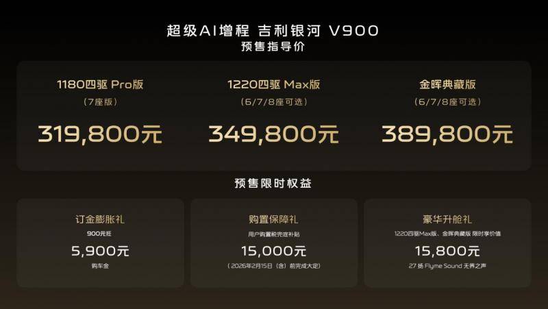 2026年1月7日,吉祥银河正式发布了其V系列首款车型——银河V900的预售价格,三个版别车型的预售指导价区间为31.98万—38.98万元。作为品牌旗下的全新旗舰MPV,银河V900以“AI全场景家庭旗舰MPV”为定位,其间心方针是以一套高度整合的技能计划,切入30-40万元级新能源家用奢华MPV这一竞赛日趋白热化的商场。